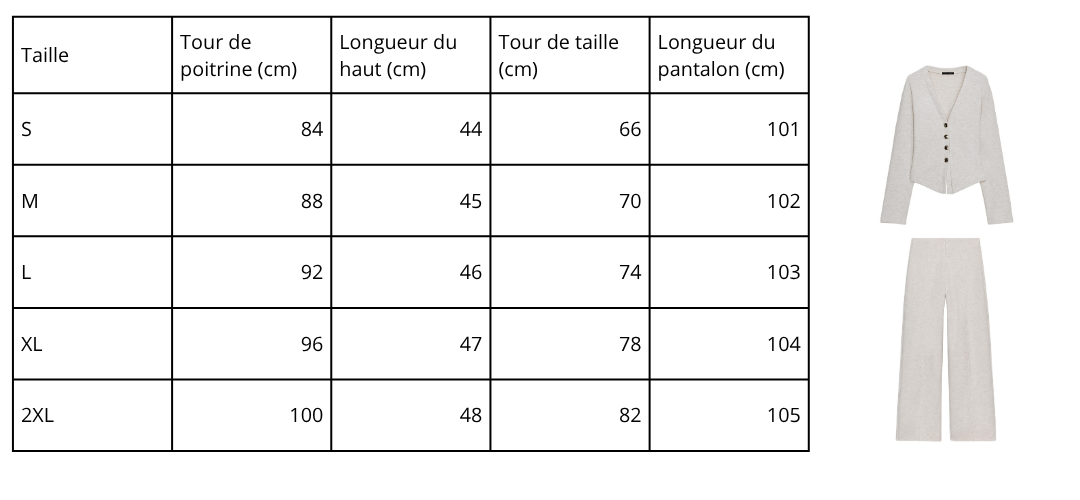 • Longueur : Gilet à manches longues + pantalon taille haute à jambes droites