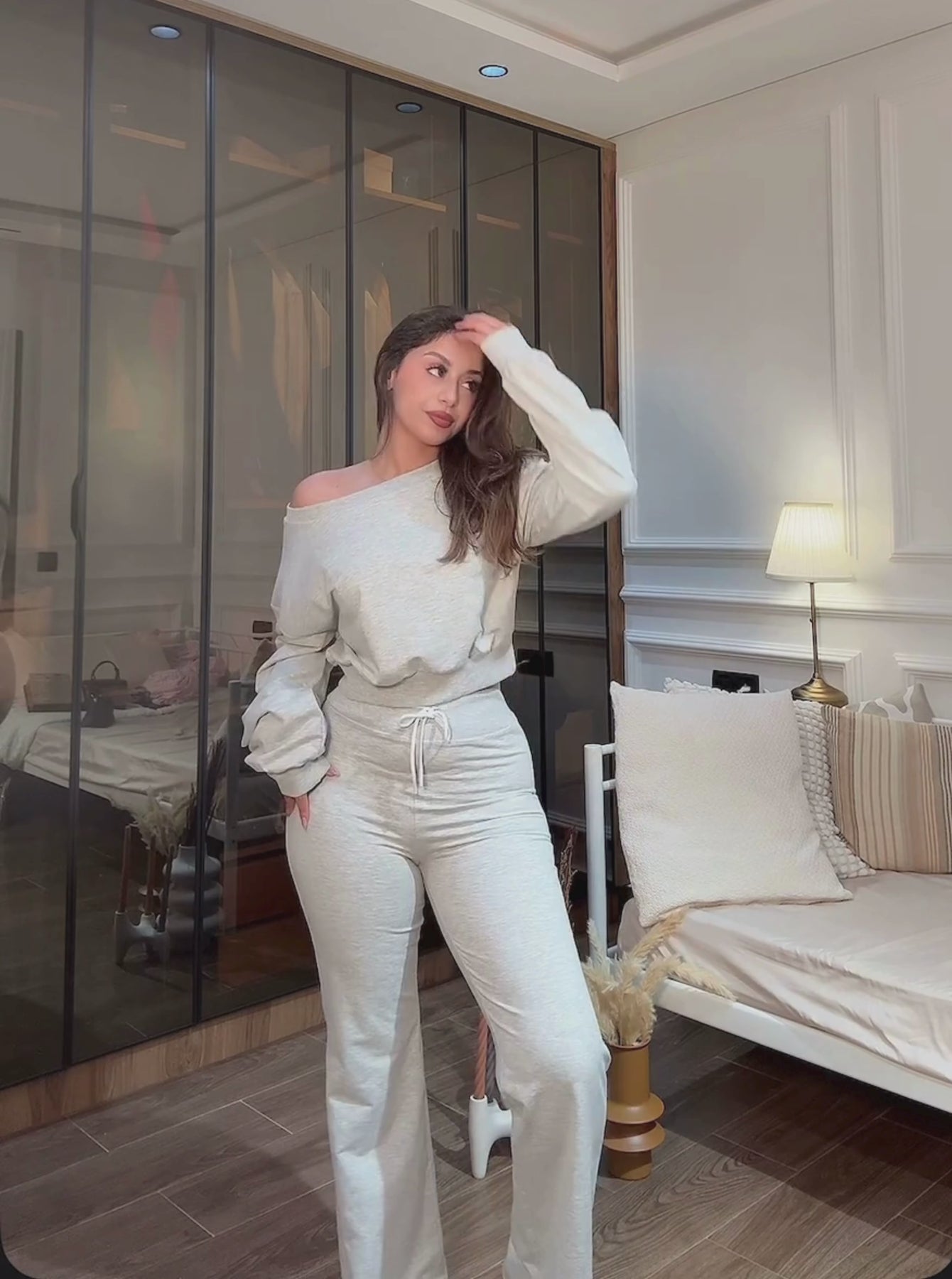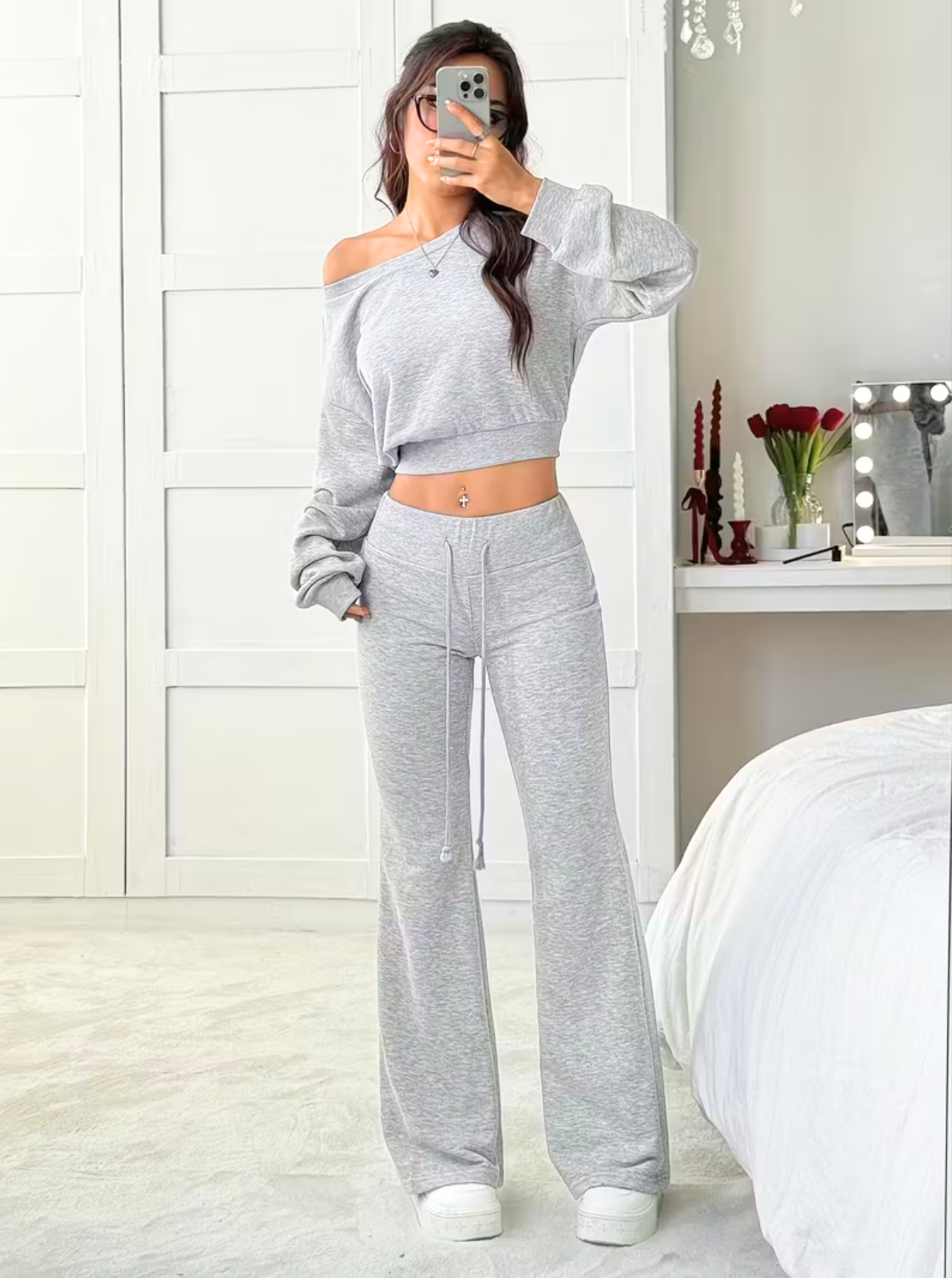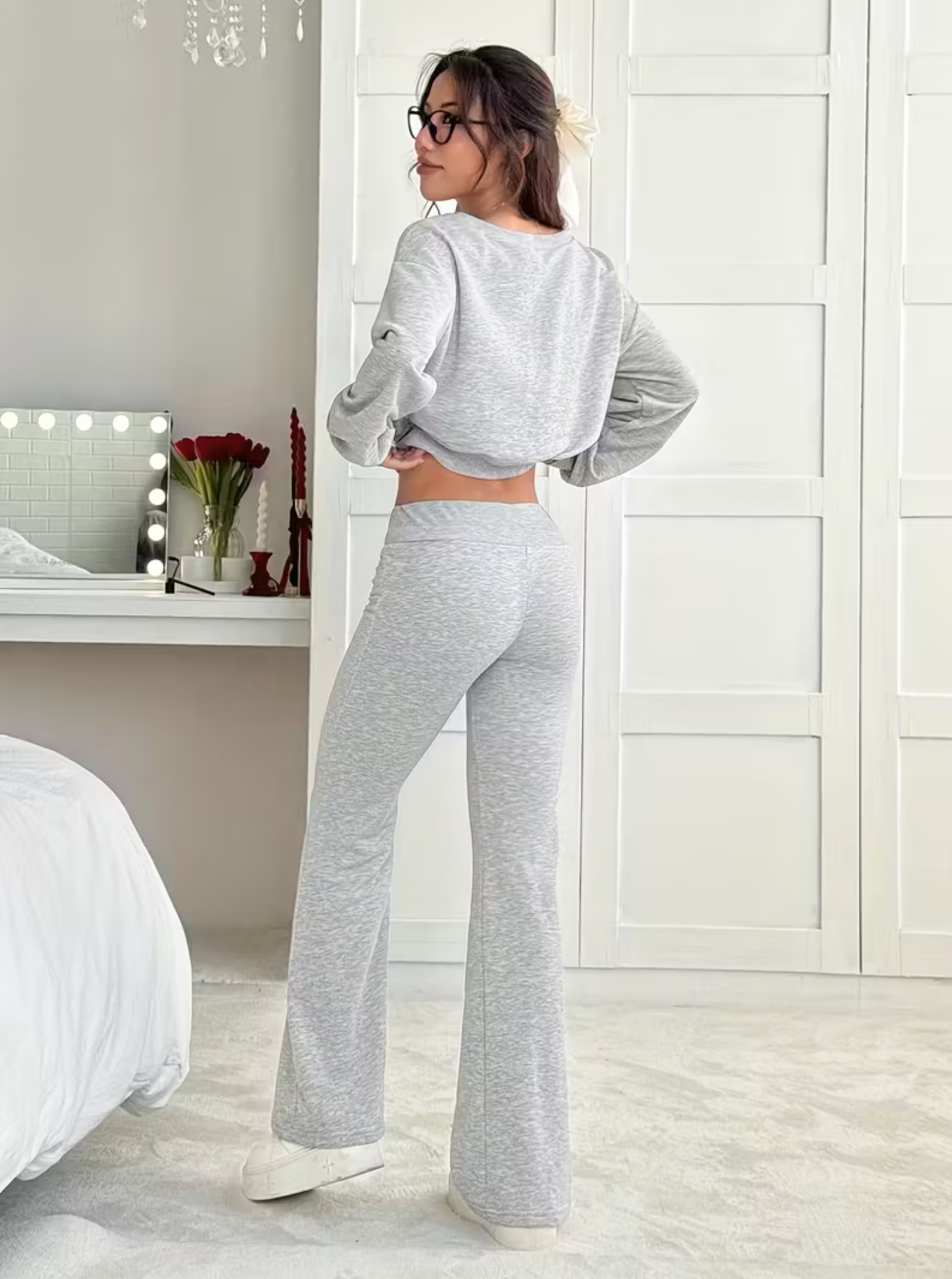 Ce set deux pièces gris clair incarne le parfait équilibre entre confort et style. Composé d’un top moulant à manches courtes et d’un pantalon taille haute légèrement évasé, il sublime la silhouette tout en offrant une sensation seconde peau. Son tissu extensible et ultra doux épouse les courbes sans comprimer, idéal pour vos journées chill comme pour vos sorties casual.
