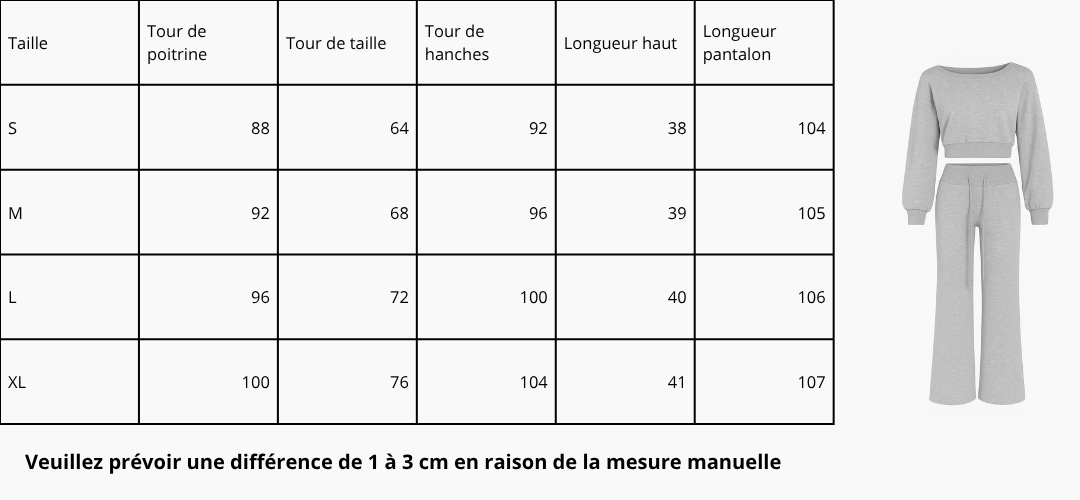 Détails du produit : Style : Minimaliste, décontracté, moderne Motif : Uni Coupe : Ajustée en haut, évasée en bas Longueur : Haut court + pantalon long Tissu : Mélange doux stretch (cotton & élasthanne) Épaisseur : Légère à moyenne Élasticité : Haute – s’adapte à la morphologie Taille : Haute, gainante sans serrer